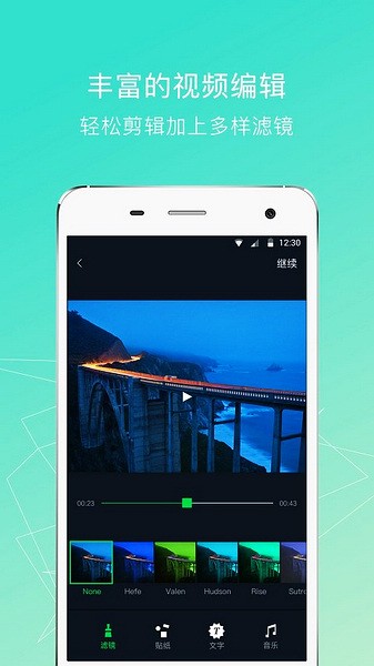 5、10秒快拍一键编辑分享微短片,提供剪辑、个性化滤镜、配乐等功能,无需专业复杂的编辑,即可充满创意,趣味盎然。