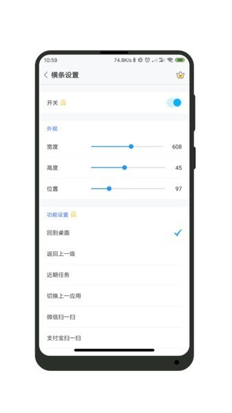 此外,用户们还可以根据自己的喜好和使用习惯来自定义手势、颜色和透明度等外观参数,也让手机界面看起来更加美观。作为一款功能非常全面的手势操作软件,一键全面屏app能够非常好的满足大家不同的手机玩法,用户们也能够关闭和开启手势操作功能,因此完全不需要担心会影响自己的日常使用。