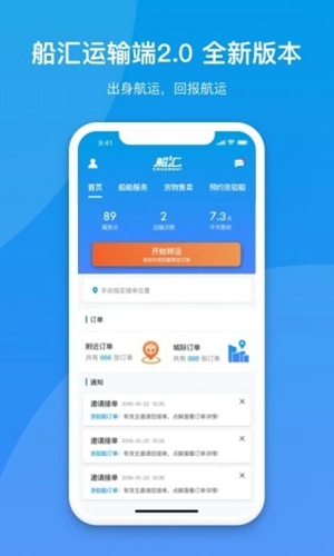 船汇运输船APP是一款主打航运货船接单的软件,界面简洁清爽,功能丰富强大,汇集众多货主、货源,为从事航运的用户提供海量订单,一键轻松接单!且平台还提供了多种船舶服务,与中石化联盟,让你优惠加好油!同时也为货主带来众多各类型号的运输船只,满足各项航运需求,在线快速下单,为你极速调度,货物也会派遣专人为你送货上船,更省心!