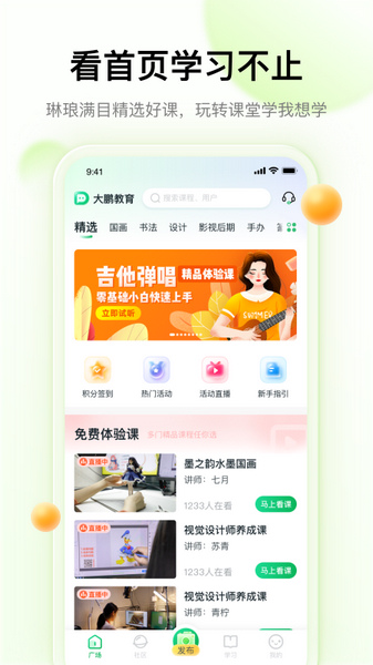 大鹏教育是一款艺术类课程在线教育学习平台软件。这款软件内有多种不同类别的艺术课程资源,设计、绘画、书法等艺术课程都可以在这里报名学习。众多知名艺术讲师在这里开设课程教学,多年的从业教学经验为学生带来最佳的教学体验,每一处知识点和细节都不落下,手把手传授每一个技巧,带领学生登堂入室。课程中除了视频和文字教学之外,还会有直播课程的开设,在直播间可以与教师在线进行沟通,还可以连麦互动,面对面深入交流。此外,教师还会给学生布置课后课外作业,学生在按照教师要求完成作业后需要通过软件将作业上传,由教师在平台内进行批改,之后学生可以查看教师的批语。如果学生在学习后对某一知识点尚不能理解的话,除了去咨询教师还可以反复观看课程教学视频揣摩,随时复习温习。在公共区可以看到其他学生上传到平台的作品,可以在这里展示自己的作品也可以与其他人的作品对比来衡量自己的水平,还可以拍摄上传自制的小视频展现自己的才艺。
