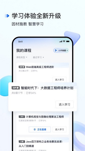 这款软件有很多功能,比如直播、录播、AI互动剧本等多样化教学方式,能满足不同用户的学习需求。它还提供了很多热门高薪职业的课程,比如产品经理、数据分析师等,并且有超过48位行业名师专职授课,教学质量很高。此外,开课吧还有智慧学习管理系统,能帮助用户制定学习计划和提高效率。