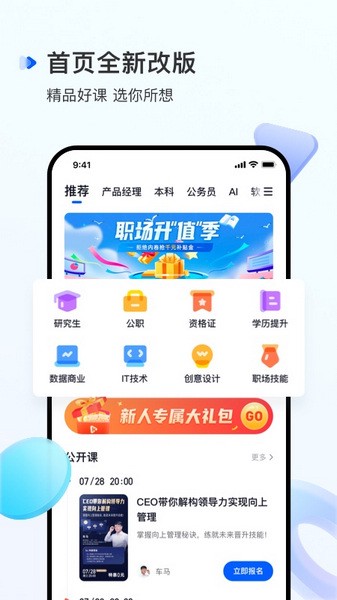 开课吧APP是一款专注于在线教育和技能培训课程的平台,不管是考研、考公还是考职业资格证,大家都能够在这里找到所需要的课程内容。此外,针对不同用户的学习需求,开课吧还提供了包括公开课和创意设计、职场技能等在内的多个板块,可以帮助在职人员提高竞争力,大学生们也能够在开课吧职业教育平台上寻求所需要的成长空间。