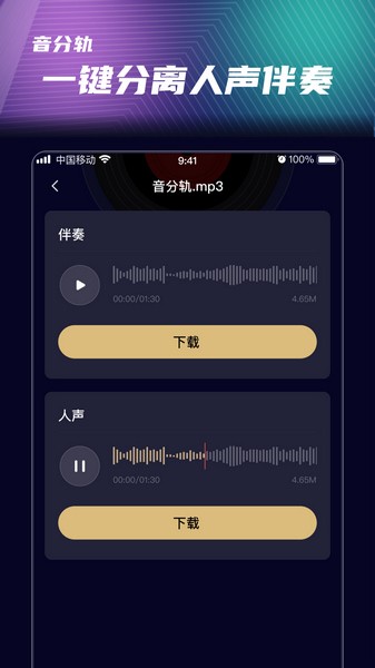 音分轨是一款操作方便的手机音频提取编辑软件。这款软件可以帮助用户快速提取文件中的音频,将原本的音频分离出来单独生成一个文件。软件能够识别文件中不同的音频,伴奏、人声等都可以精准识别并分离出来。在完成音频提取之后用户可以对音频文件进行编辑,可以使用软件内置的推荐编辑模式来快速剪切和添加需要的音频效果。