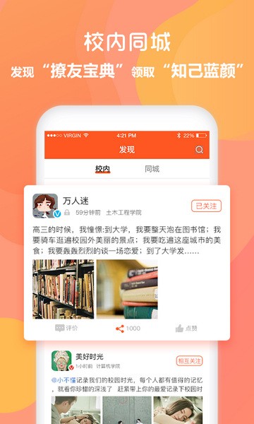 【发现】校内、同城、全国的大学生发表朋友圈动态,成为校园的人气之星,这里发现属于自己的红颜和蓝颜知己.