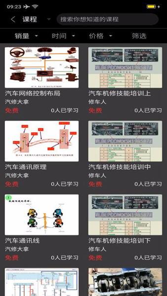 4、根据想要学习的汽修技能的不同,能够在手机中分类选择想要学习的课程;