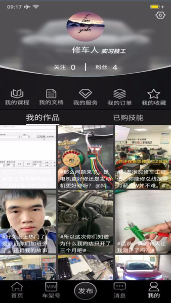 6、在app内关注分享的汽修技能短视频,还能查看用户购买视频的情况。