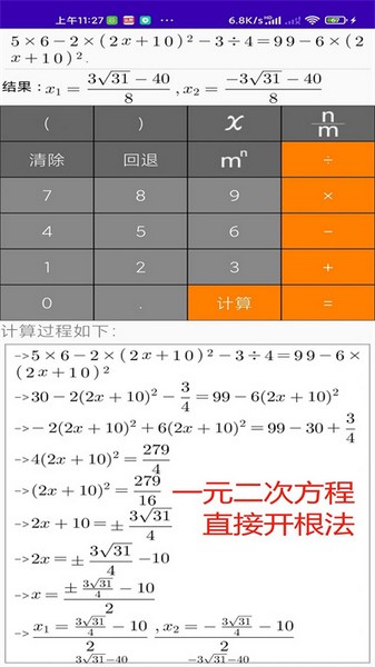2 : 不管是分式(分子/分母),指数,还是方程x,他们的输入以及每一步的显示,都更加接近书面格式, 而不象其他计算器中的分子分母之间的分号用/ , 指数用^, 还有就是方程x和乘号x区分不清.