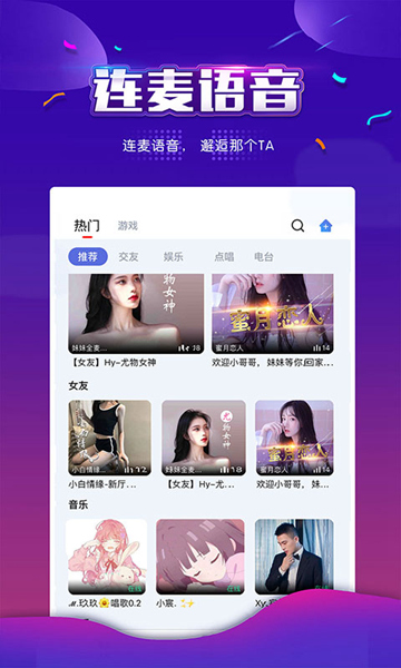 各种声音好听,灵魂有趣的用户应有尽有,满足你对交友聊天的需求;