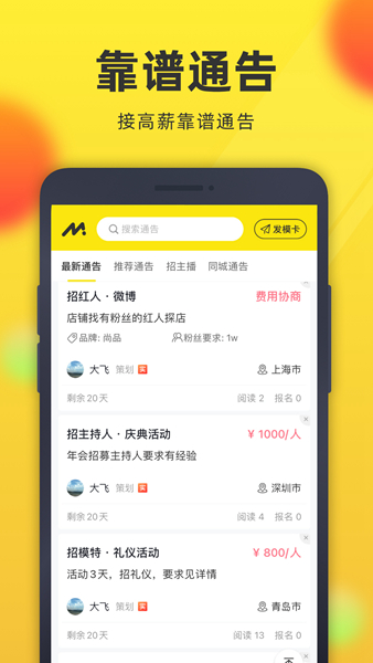 在线找模特艺人、百万演艺人才库、在线发布招聘通告。