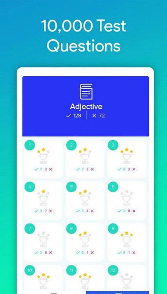 这个应用程序还提供了1300个问题,100个测验测试,模仿英语水平测试中的测试类型。
