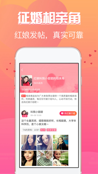 珍婚作为一个面对面视频征婚相亲婚恋交友平台,大大提交了相亲的速度和成功率,由红娘主持,通过线上视频聊天的方式帮助男嘉宾和女嘉宾相互认识了解,喜欢后互相加好友并进入深入了解。平台中存在上千红娘为男女性用户提供相亲服务。