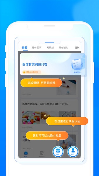 软件里有几个主要功能,一个是“医时资讯”,里面都是新鲜全面的行业信息,还有医生投稿和专家审核的真实经验分享;另一个是“趣味医学”,通过专业团队编写的问卷快速学习,还能获得奖学金和奖品激励。还有一个特别棒的功能是“医生关爱活动”,里面有很多关注医疗从业者健康的内容,参与活动还能赢取各种奖品。