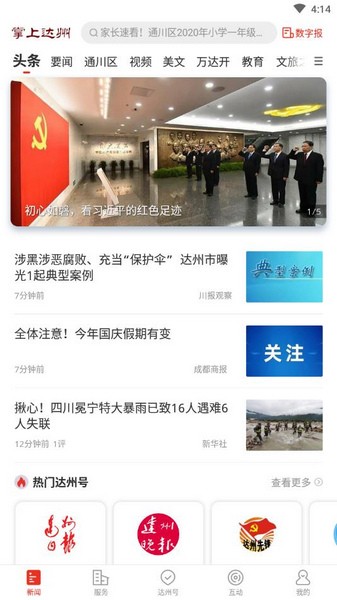 掌上达州app官方版是一款由达州日报推出的为本地居民用户准备的便利新闻资讯类应用软件。在这款软件中用户可以轻松方便地查询各类新闻资讯,在不同的频道栏目中用户可以浏览不同类型新闻文章,每天都会有全新的新闻报道刊登在这里,让用户能够及时了解国内外发生的热点事件,聚焦当前的社会热点。软件目前拥有多家报纸的电子版报纸,为用户提供排版简洁 、阅读方便的电子报纸,当期和往期的报刊都可以在这里查询。同时,软件上也入驻了当地党媒的媒体号,为读者用户带来最新的与党有关的新闻报道,将党内的变化整理总结呈递给读者,借此了解达州当地的社会发展变化,从多个角度来观察社会。除了党媒与报刊号之外,也有许多的媒体入驻了平台,聚焦于不同领域的新闻,由专业记者采访采集信息编写,将主流媒体的信息汇集在这里。此外,软件还开通了问政功能,用户对政府工作的意见看法可以通过问政窗口来反馈,将民生民意传达给政府的相关部门,解决百姓在生活中遇到的问题。
