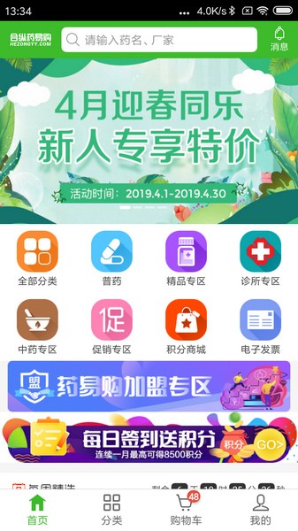 拥有常用的分类专区,在首页中能看到诊所专区、精品专区以及促销专区和普药专区等