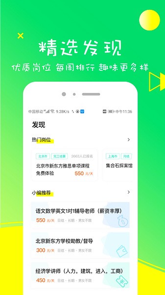 【发现】展示最受欢迎的岗位,推荐最优质的兼职,每周排行——发现时下最流行的工作。