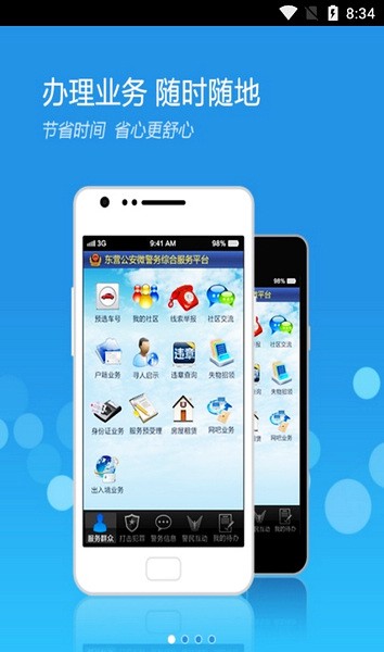 东营微警务app是东营公安分局开发的一款便民生活服务平台,软件内为大家提供了许多方便的服务,包括咨询、办事、举报、投诉、监督、考核、服务等功能于一体,并且还能帮助市民们可以和警察互动。此外软件内还为大家提供了户籍管理、出入境证件办理、交通违章查询等实用功能,为大家的生活提供了许多便捷,在东营生活的用户们可以下载使用。