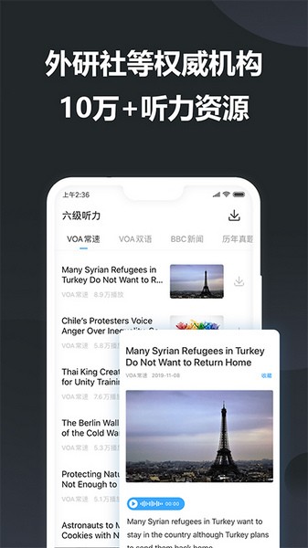 收录外研社、BBC、VOA、考试真题等10万+权威听力资源,英美发音地道纯正,多场景听力练习。