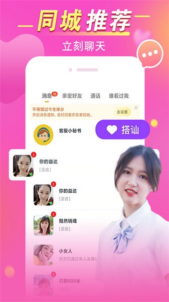 这个app有很多有趣的玩法,比如视频匹配、主动呼叫女生发起视频通话,还有真心话大冒险功能,适合喜欢互动和挑战的人。此外,高效聊天和搭讪礼物等新玩法也能让交友过程更有趣。高颜值用户聚集在这里,左滑无感右滑心动,互相喜欢就能开始聊天约会。