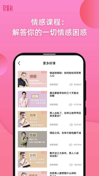 通过视频、直播、图文等多媒体形式,向用户传递脱单、恋爱、婚姻、出轨、分手等知识领域的情感技能,提升亲密关系心理学、认知科学知识储备,重塑正确理性的人际关系认知,完善自主解决情感问题能力,进而为自身建立系统而健康的恋爱观、婚姻观。