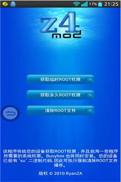 Z4ROOT是一款专门为安卓系统打造的一键root神器,获得root权限后,用户们就可以使用手机轻松卸载掉不需要的手机软件,帮助大家释放更多的手机内存。此软件支持所有的Android机型,所以大家不用担心一键root后手机会变成板砖的风险,而且操作非常简单,用户们在手机端安装z4root后,点击root,等待手机自动重启即可root,如果root失败或者不成功只需要重新重启即可恢复原状,有需要的快来下载吧!