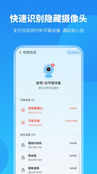 2、隐藏摄像头识别/防偷拍:帮助您了解所处环境中是否有潜在的被偷拍风险