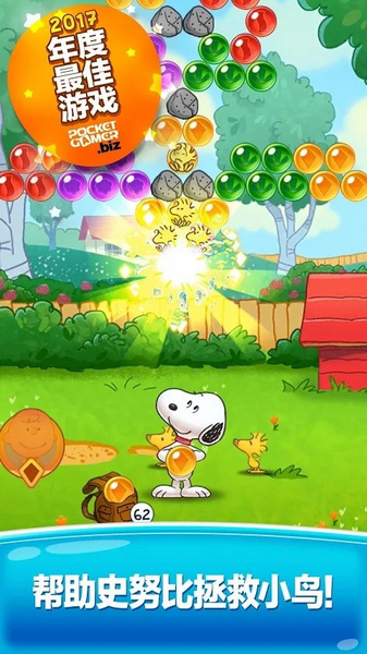 史努比泡泡是一款以《史努比》漫画角色为主题的消除游戏,玩家可以和史努比、查理·布朗等熟悉的角色一起挑战各种有趣的关卡。游戏中有超过100个关卡,还有新关卡不断更新,玩法主要是通过发射炮弹击中同色的泡泡来消除它们,同时需要在屏幕上填满泡泡前完成任务。
