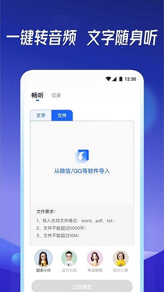 出门听听支持自己上传文档、文字,一键转成音频,随时随地畅听喜欢的内容。
