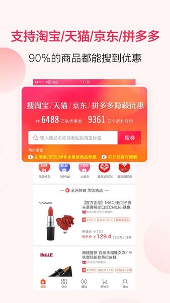 【支持各大平台】淘宝、天猫、京东、拼多多、唯品会、1688、当当、饿了么、美团、唯品会等,海量隐藏优惠券和返现红包,90%的商品都能搜到优惠!