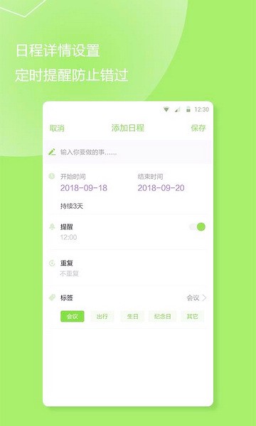 3、拥有日程详情设置,选择具体的时间定时提醒防止错过;