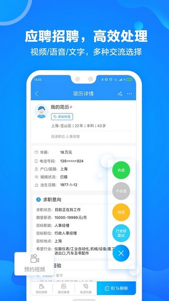 2、在线畅聊:和求职者想聊就聊,推荐职位,邀请面试,高效沟通。