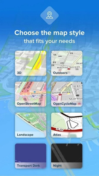 多种地图风格: 基础,OpenCycleMap, OpenStreetMap, 3D,夜间模式 (高级版)