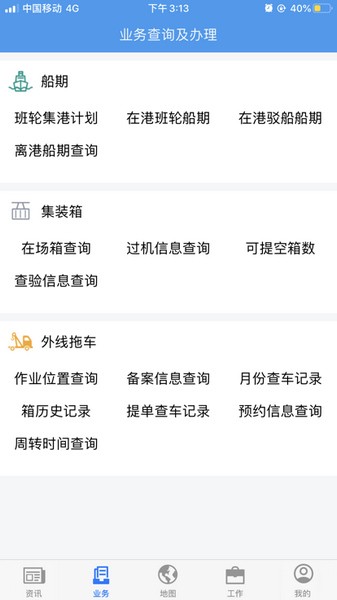 船舶装卸查询、出入境门查询、码头装船日期查询、VGM信息查询、海关放行查询、单箱信息查询、可用箱信息查询、铁路到货查询、铁路发送查询、水运查询