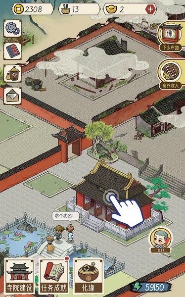 4. 开启化缘 — 下山化缘,便有机会获得丰富的道具和相关事件,从而更好的建设寺庙。