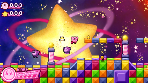 星之卡比银河故事是一款以星之卡比为主角的像素风横版闯关游戏。在这款游戏中玩家可以控制星之卡比在各种设计巧妙的关卡中行走,避开障碍和陷阱,利用场景机关等顺利通过一个又一个的关隘,有时候还会需要其他的卡比。此外,在冒险的过程中玩家还可以拾取道具来获得强化能力,突破重重封锁冲向终点。游戏的画风延续了星之卡比的可爱卡通风,关卡难度也不高。