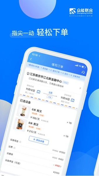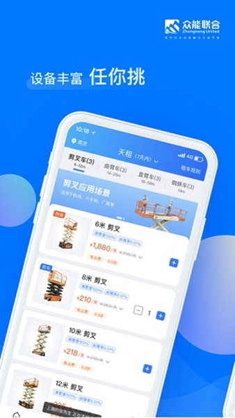 众能联合app是一款高空作业设备租赁软件,用户可以通过软件体验一站式租赁服务,只需要轻点指尖,就能解决工业车租赁问题。在众能联合app中,用户完全不用担心工地工程车不够的问题,软件内包含了多种功能的高空作业工程车,租金实惠、站点多,就近调度,让用户的工程进度不再会因设备问题而停工,无法处理。