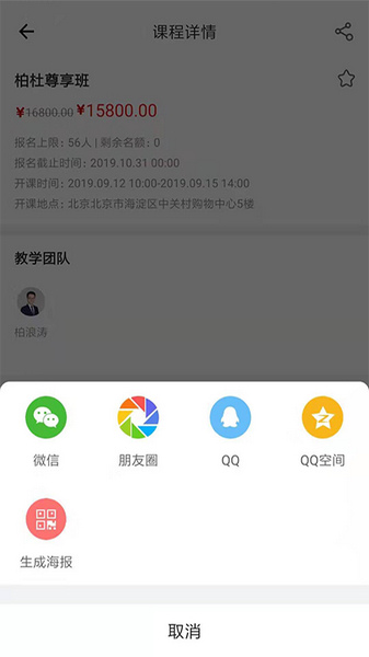 支持将课程转发出去,与好友一起报名学习课程姿势,可直接转发微信好友;
