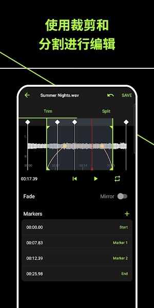 • 使用修剪或拆分选项(包括可调节淡出曲线和标记)编辑录制文件