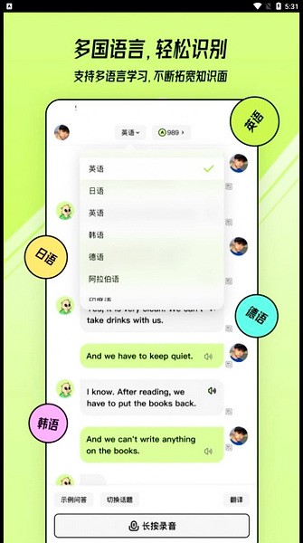 使用我们的应用,你可以轻松地在不同的话题之间切换,确保你在语言学习之旅中永远不会感到无聊或停滞不前。无论你是想讨论时事,谈论你的爱好,还是练习你的专业技能,我们的应用程序都能满足你!