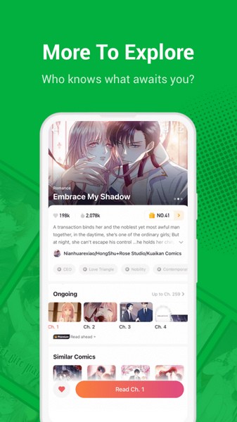 软件的特点很明显:独家合作的创作者很多,漫画画风高清又多彩,剧情跌宕起伏,读起来 totally 会上头!评论区还能分享自己的想法,甚至能和作者互动,这真的挺酷的。