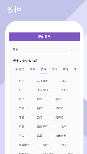 2. 智能查询:用户只需输入一个汉字,应用就会智能分析并显示出所有与之押韵的汉字,提高了创作效率。