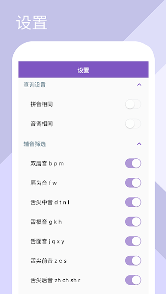 5. 设置灵活:用户可以在设置中设置口音、查询设置、辅音筛选等,以满足个性化的创作需求。