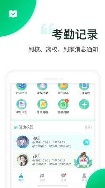 系统自动统计孩子进校、离校时间,迟到、早退一目了然。