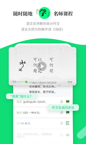 支持文字、音频、视频多种学习模式,名师主讲,深入浅出。涵芬将课程与工具书深度结合,每一节课重点标注知识点和疑难字词,难点一网打尽。