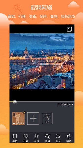 【视频编辑】 剪辑、编辑和合并视频,倒放,裁剪视频片段 从相册导入多段视频、图片,剪辑片段合辑 可以分享给朋友,随心所欲编辑视频特效