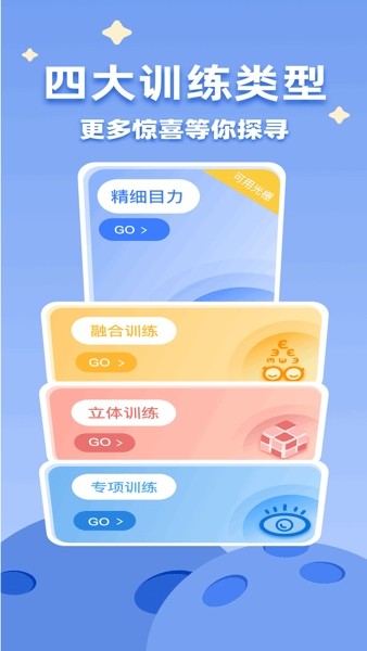 睛晶乐弱视宝典是一款专为视力恢复训练所打造的辅助软件,通过这款软件能够帮助用户快速的进行视力恢复训练,有着多种全新的训练方式供用户进行选择,并且针对各位视力的度数进行了合理的分配,在保证训练效果的同时又不会让患者感到过度的疲劳。该软件为用户提供了便捷高效的训练方式,满足用户的各种需求,有需要的小伙伴快来下载吧。