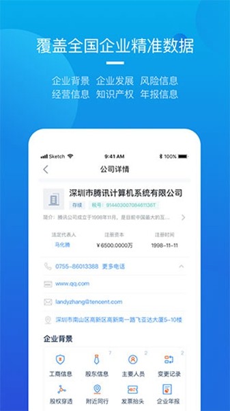 企业背景:工商信息、股东信息、懂事监事人员信息、企业变更记录、股权穿透图、附近同行企业信息、发票信息、地址、联系电话