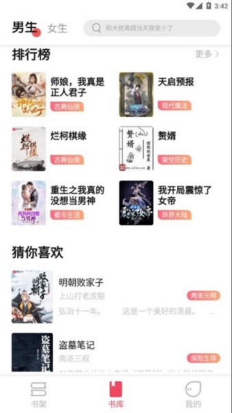 3、书库精选推荐书籍,还包含多个小说分类,根据你的喜好为你推荐优质小说(书库页面分男生/女生,很人性化)
