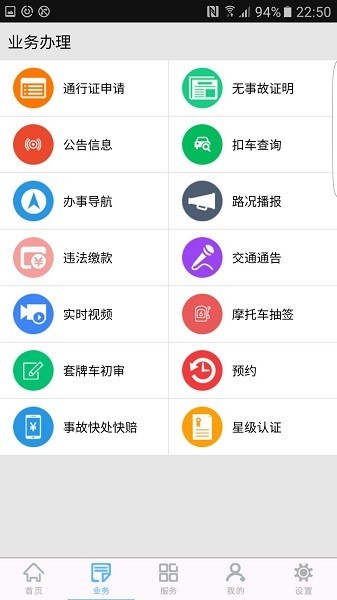 该板块包含通行证申请、无事故证明、公告信息、扣车查询、办事导航、路况播报、违法缴款、交通通告、实时视频、摩托车抽签、套牌车受案初审、预约、事故快处快赔、星级认证功能。