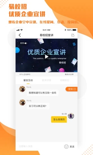易校招校园APP是一款主打大学生校园求职的软件,界面简洁清爽,功能丰富强大,众多优质企业公司云集,带来多种岗位,囊括网络、前端、后台、销售、营销等,满足不同专业方向的学生寻找工作,支持在线向HR发起询问,一键投递简历,在线求职面试,更便捷!同时平台还支持在线参加优质企业宣讲、双选会等功能,把握每一次求职机会!此外更有海量职前课堂资料等你来学,助你提升入招记录!