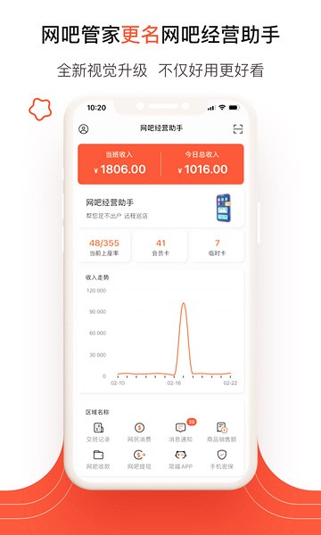 如果有经营网吧的老板们今天推荐的这款网吧经营助手app绝对是你不能错过的软件,其中为大家提供了许多便捷的网吧管理服务,让大家可以轻松掌握网吧的状况。通过该软件,店网吧管理员即使不在网吧也可以看到网吧实时的上机人数,同时还可以对工作人员交办的信息自动处理,以及网吧每天的收入等信息全都一目了然,它将为大家生成一个可视化表格,让管理更加高效。